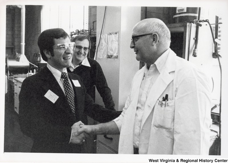 - Congressman Nick Rahall II shaking the hand of a unidentified Union Carbide scientist. An unidentified man is standing behind Congressman Rahall.
