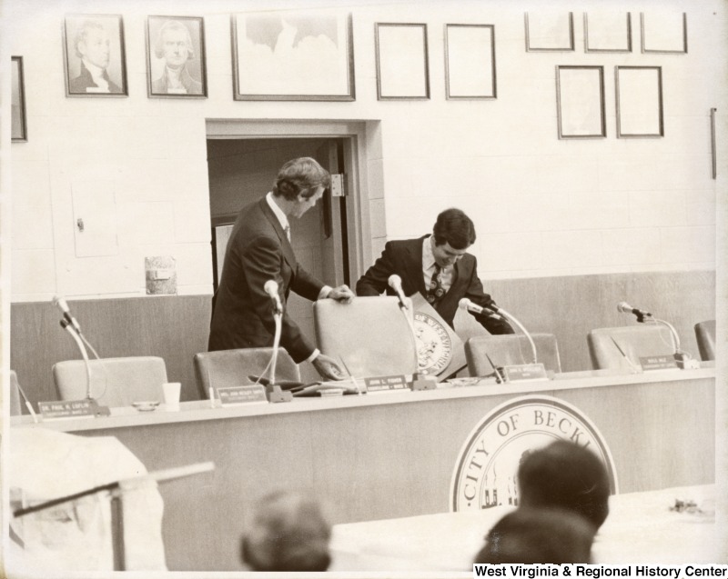- Congressman Nick Rahall II (right) with an unidentified man in front of a unidentified group in Beckley. Congressman Rahall is pulling out a large seal plaque from under the table. There is a table in front of them with a seal stating the City of Beckley.
