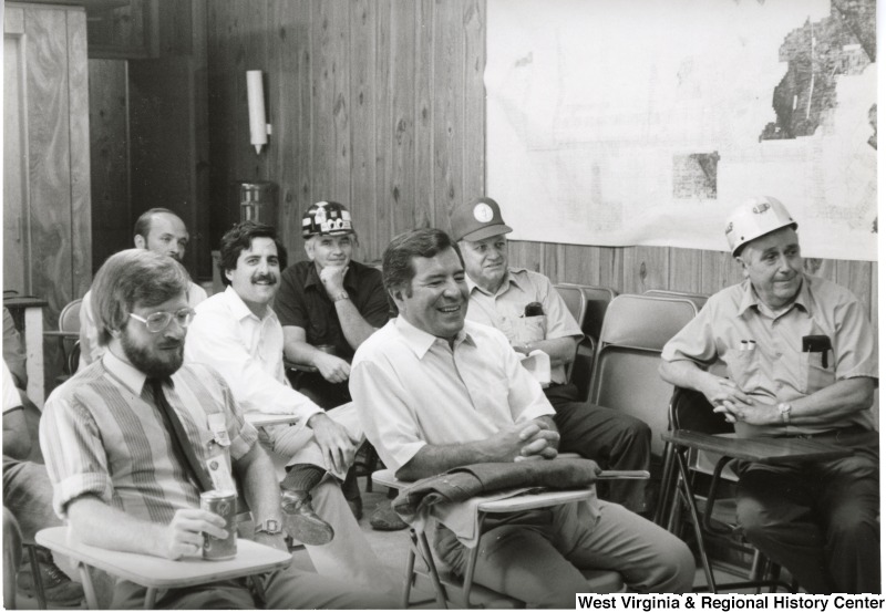 Photograph of Congressman Rahall sitting with a group of Old Ben Coal Mine miners and Bob Stone, Secretary-Treasurer of UMWA