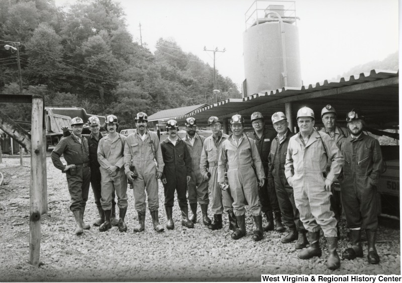 - Congressman Nick Rahall dressed in a coal miner uniform outside of Old Ben Coal Mine with a group of unidentified coal miners.