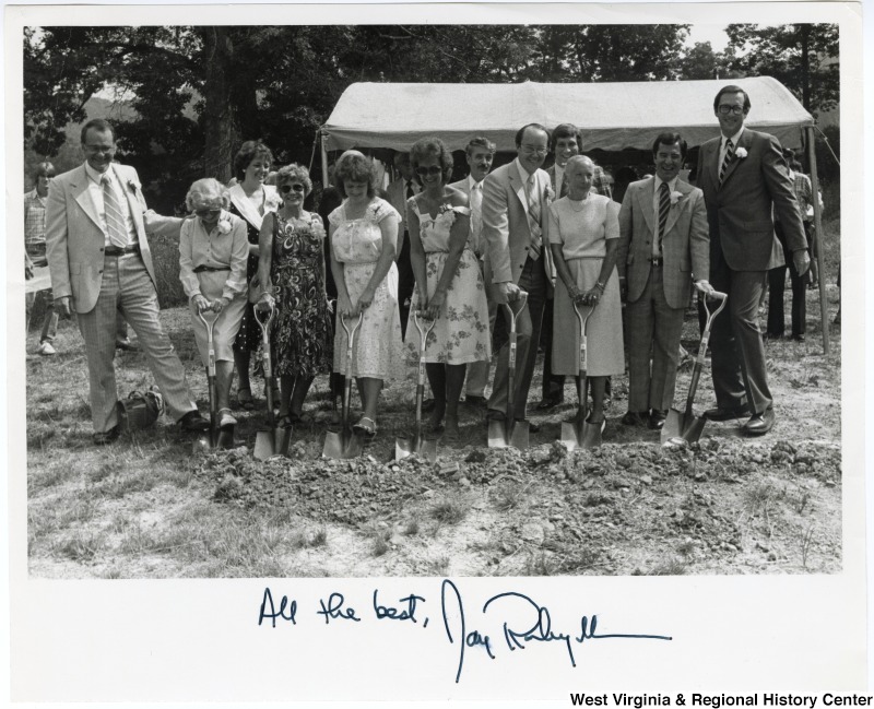 - Congressman Nick Rahall, II (second from right) and Senator John D. Rockefeller IV (far right) alongside a group of unidentified people shoveling into the ground at a groundbreaking ceremony. The photograph is signed on the front and reads, "All the best, Jay Ruby II."