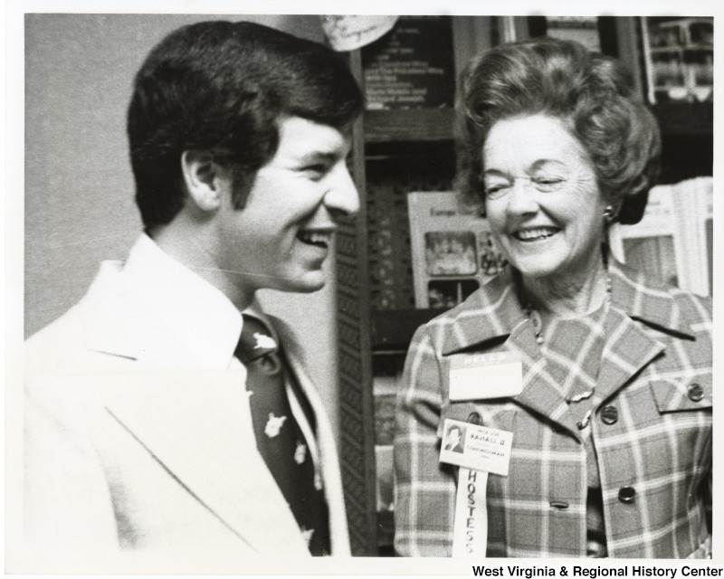 - Congressman Nick Rahall II laughing with a unidentified woman wearing a hostess ribbon.