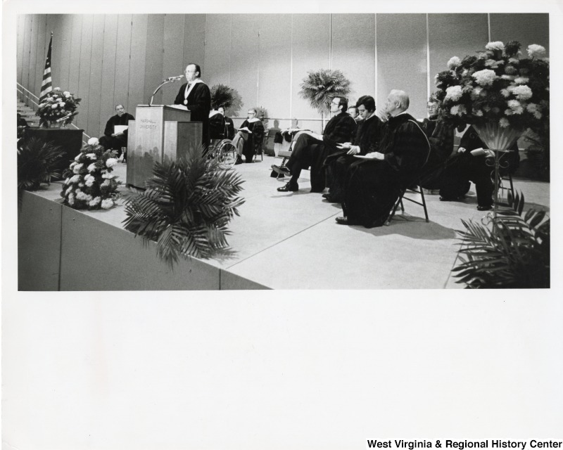 - From left to right: Senator Jennings Randolph; speaking at the podium is President of Marshall University Bob Hayes; seated is Governor Jay Rockefeller; Congressman Nick Rahall II; and Congressman Arch Moore Jr. participating in the 1985 Marshall University Commencement program.