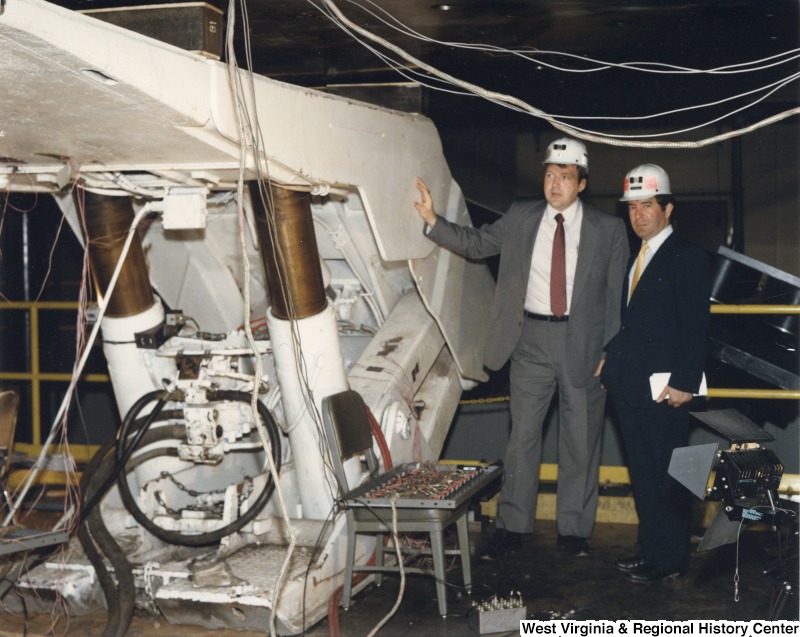 - Representative Nick J. Rahall (D-W.Va.) with an unidentified man standing beside mining machinery equipment.