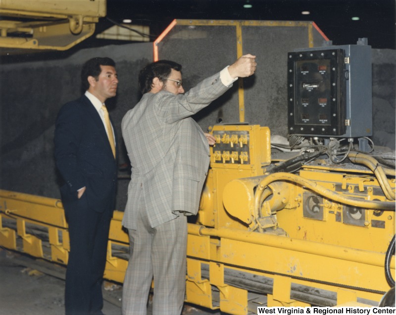 - Photograph of Congressman Rahall with an unidentified man in front of machinery