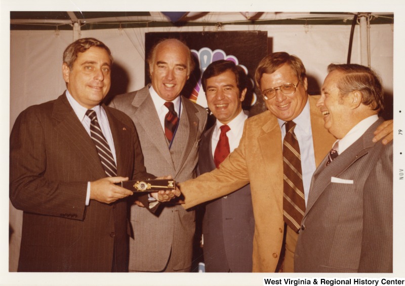 - Photograph of Fred Silverman, George Andrick, Congressman Rahall, George Mallott, and Dick Barton at the WSAZ-TV3 30th anniversary party