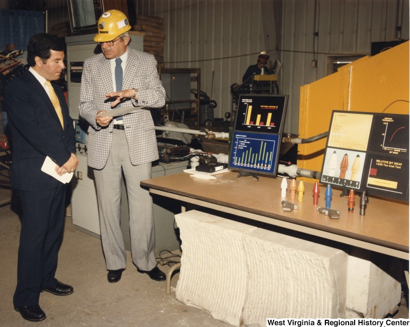 - Representative Nick J. Rahall (D-W.Va.) speaking to an unidentified man in front of various displays about coal mining.