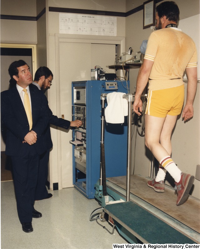 - Photograph of Congressman Rahall with an unidentified man on a treadmill