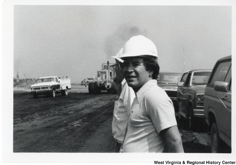 - Congressman Nick Rahall II with an unidentified man outside with some machinery. Congressman Rahall is wearing a hard hat.