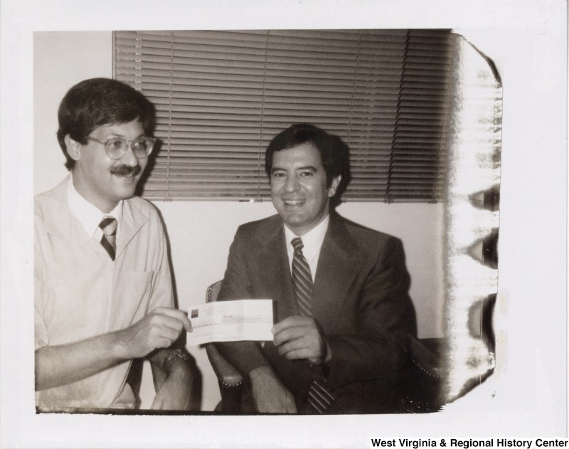 - Congressman Nick Rahall, II with an unidentified man. Both are holding the ends of a check.