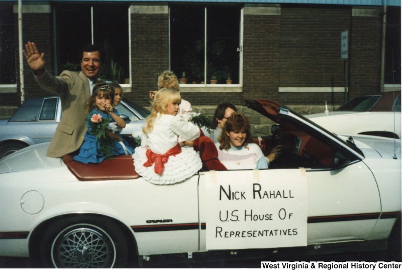 - Representative Nick J. Rahall (D-W.Va.) waves from an open car during the Good Bear Parade. Three unidentified children and two unidentified adults ride in the car with him.