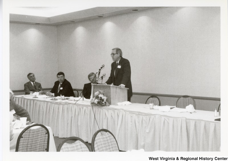 - Photograph of Buzzy Wilkinson, CEO of First Century Bank, speaking at an Economic Development Seminar