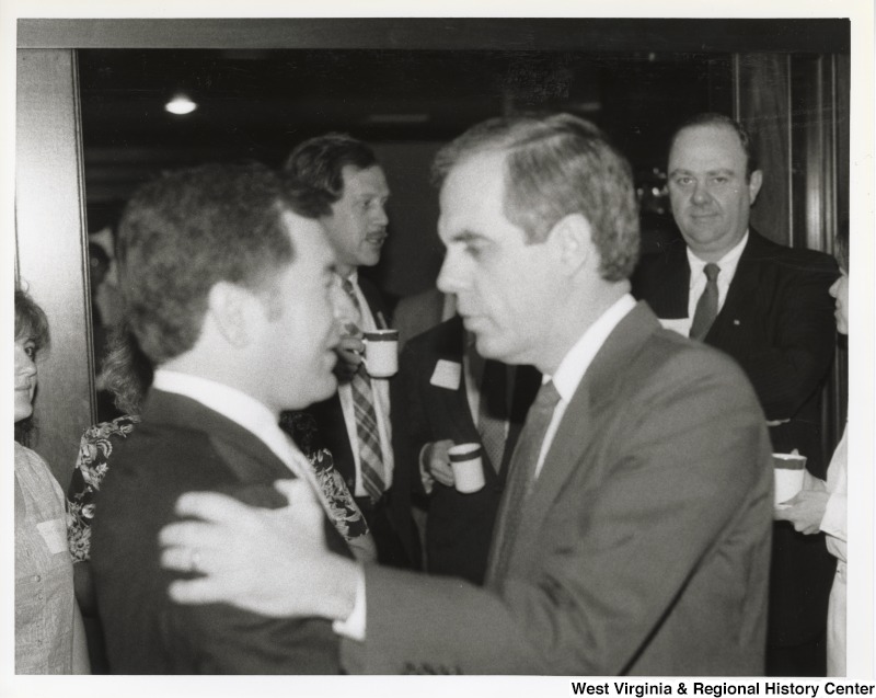 - Congressman Nick Rahall speaking with Congressman Tony Coelho (D-CA) at a breakfast.