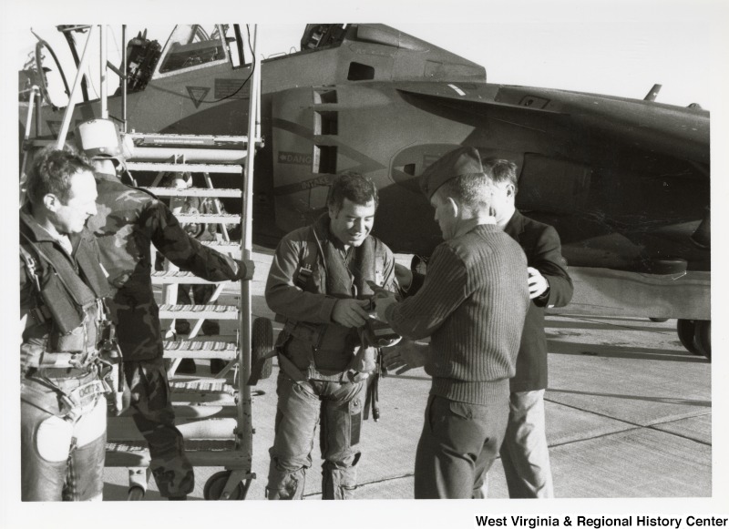 - Photograph of Congressman Rahall talking to two unidentified U.S. Marine Corps service members in front of a harrier jet at Marine Corps Base Quantico