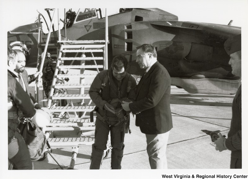 - Congressman Nick Rahall with an unidentified man in front of a harrier jet in Quantico, Virginia.
