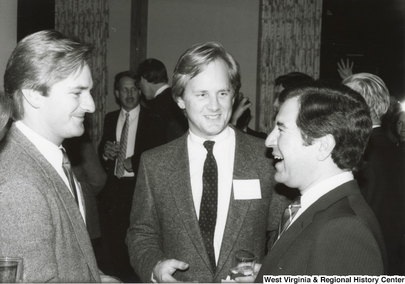 - On the far right, Representative Nick J. Rahall (D-W.Va.) speaks with two unidentified men.