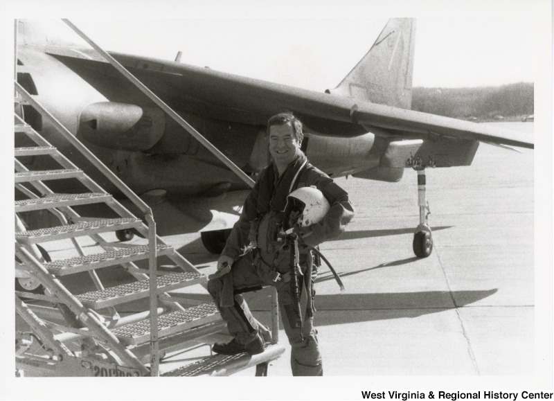 - Congressman Nick Rahall dressed in a flight suit in front of a harrier jet at Marine Corps Base Quantico, Virginia.