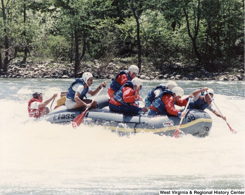- Nicholas Willis (front right), Congressman Rahall (front left), Ambrose Ethington and Tony Culley-Foster (second row), Gerry Burkot and Clyde Walton (back row) rafting the New River Gorge National River, West Virginia.