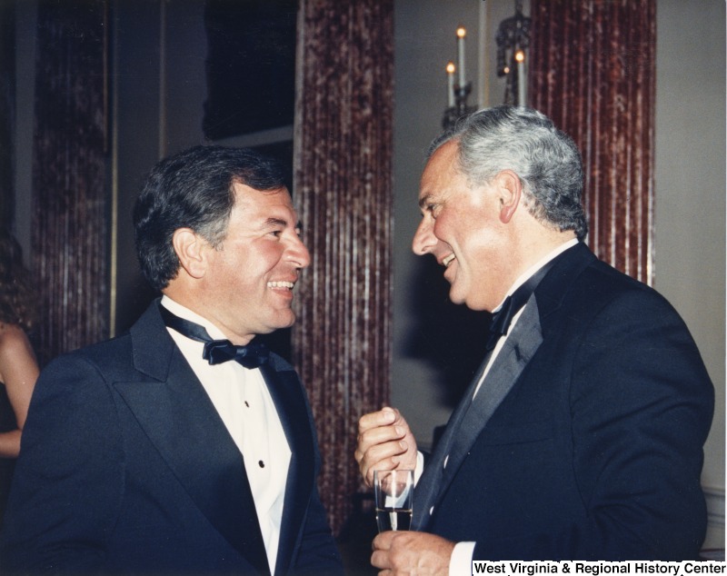 - Photograph of Congressman Rahall speaking with Nicholas Mills at a Department of State Dinner