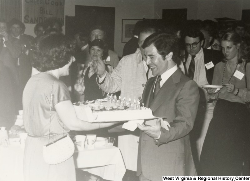 - Vicki Rahall presenting a birthday cake to Congressman Nick Rahall for his 30th birthday fundraising party. Senator Jennings Randolph is between them, partially obscured by Rahall.