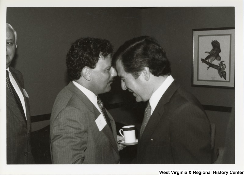 - On the right, Representative Nick J. Rahall (D-W.Va.) talks with an unidentified man at an event.
