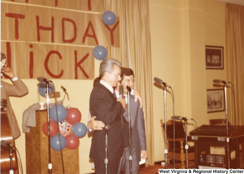 - Senator Robert C. Byrd and Congressman Nick Rahall speaking at Congressman Rahall's 30th birthday fundraiser party. A band is standing behind them waiting to play. On the wall is a banner saying "Happy Birthday Nick."