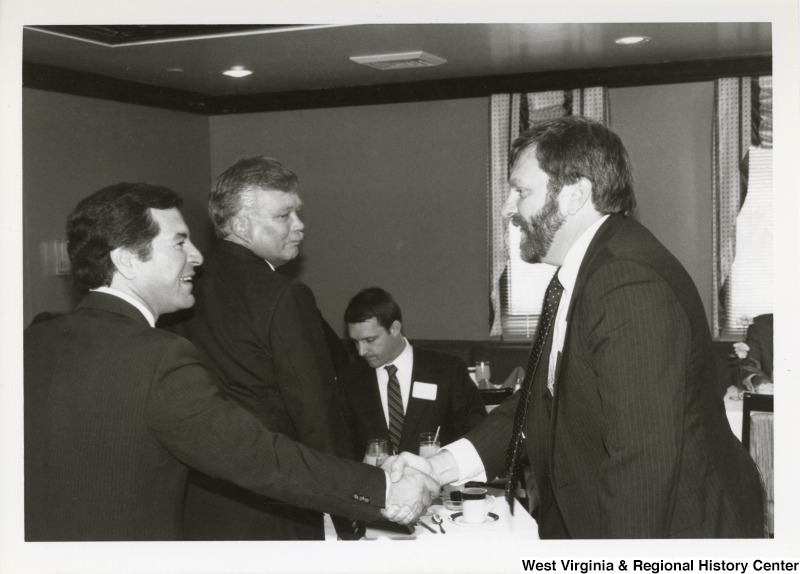 - On the left, Representative Nick J. Rahall (D-W.Va.) shakes hands with an unidentified man at an event, with two other unidentified men in the background.