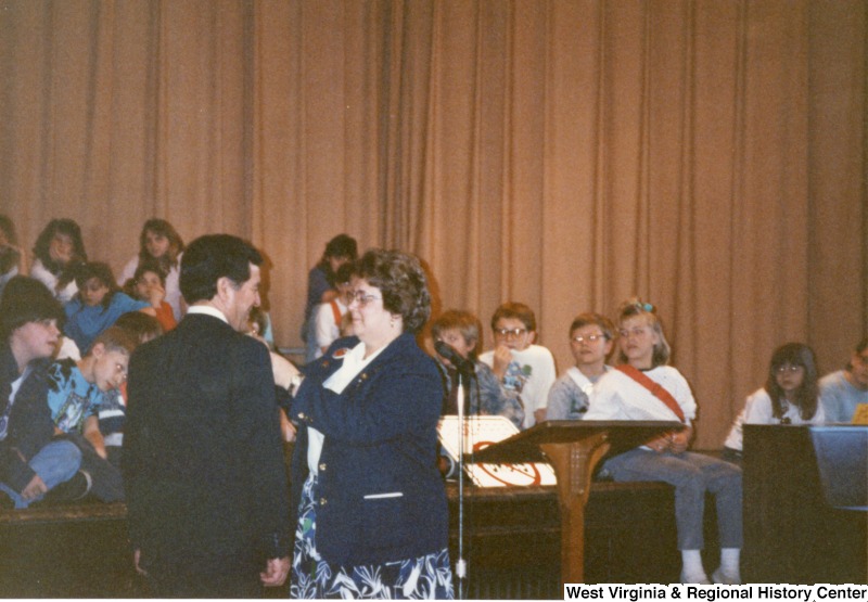 - Photograph of Congressman Rahall receiving a pin at Monroe Elementary School