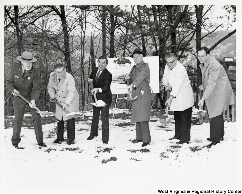 - Congressman Nick Rahall (D-WV), Senator Robert C. Byrd (D-WV) and United States Park Service Sergeant, Joe Kennedy and three unidentified men participating in the Groundbreaking ceremony for Canyon Rim Visitor Center, New River Gorge.