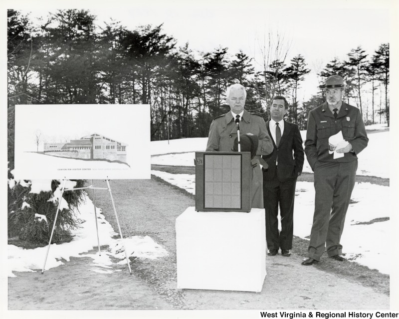 - Senator Robert C. Byrd (D-WV) making a speech before the ribbon cutting for New River Gorge Park. Congressman Nick Rahall (D-WV) and United States Park Service Sergeant, Joe Kennedy are seen listening behind him.