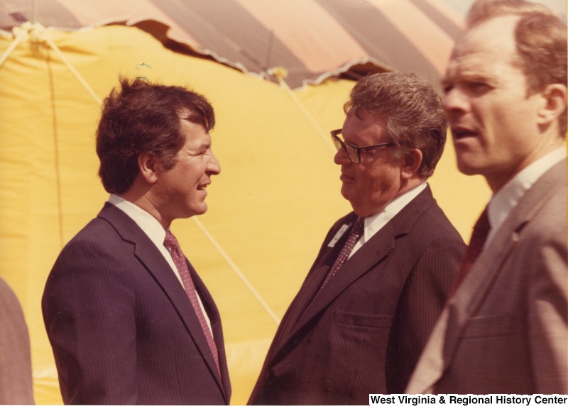 - On the left, Representative Nick J. Rahall (D-W.Va.) talks with two unidentified men at an event outdoors.