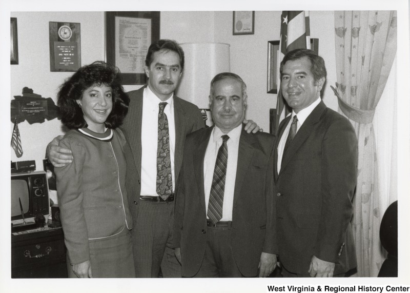 - On the right, Representative Nick J. Rahall (D-W.Va.) poses for a photo with two unidentified men and an unidentified woman inside of an office.