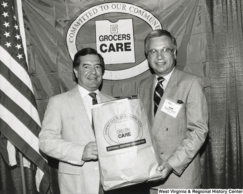 - Congressman Nick Rahall (D-WV) holding a brown paper grocery bag with Thomas K. Zaucha, Chief Executive Officer of the National Grocers Association (NGA).
