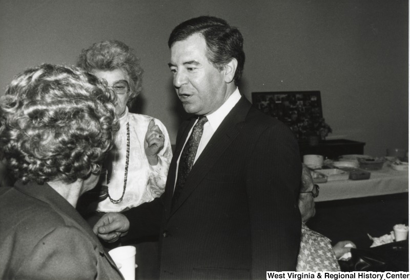 - On the right, Representative Nick J. Rahall (D-W.Va.) talks with two unidentified older women.