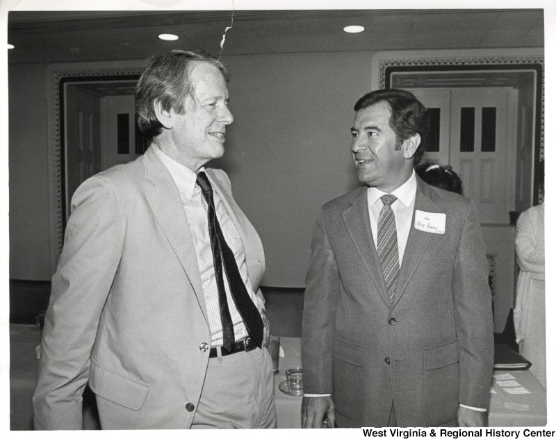 - On the right, Representative Nick J. Rahall (D-W.Va.) talks with an unidentified man at an event.