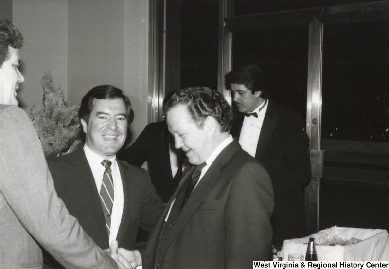 - Congressman Nick Rahall II with two unidentified men at one of his birthday parties. The two unidentified men are shaking hands. Two other unidentified men are standing in the background.