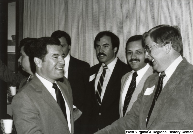 - Congressman Nick Rahall II (left) shaking the hand of an unidentified man at his birthday party. Four unidentified men are standing with them.
