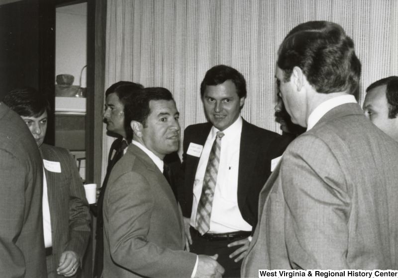 - Congressman Nick Rahall II (center) speaking to six unidentified men at his birthday party.