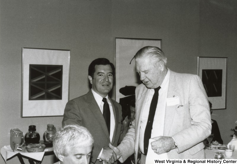- Congressman Nick Rahall II (left) shaking the hand of an unidentified man at his birthday party.