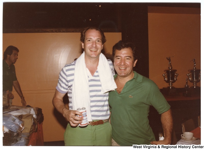 - Congressmen David Cornwell (left) and Nick Rahall, II (right) after the 1984 Congressional Golf Tournament.