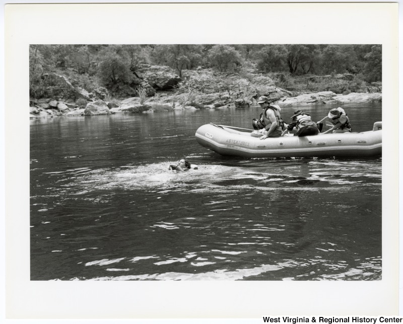 - Congressman Nick Rahall (left) swimming in the Tuolumne River in central California during a whitewater rafting trip. Three unidentified people sit in the raft to the right.