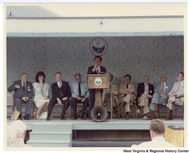- Congressman Nick Rahall, II (center) speaking at the groundbreaking of the Beckley sewage treatment plant. Senator Jennings Randolph sits to the far left on the stage and Senator Robert C. Byrd sits third from the left.