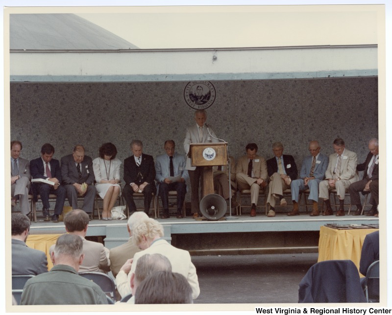 - An unidentified man speaking at the groundbreaking for the Beckley sewage treatment plant. Seated behind the unidentified man is Congressman Nick Rahall, II (second from left) and Senators Jennings Randolph (third from left) and Robert C. Byrd (fifth from left).