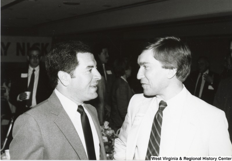 - Congressman Nick Rahall II (left) speaking to an unidentified man at his birthday party.