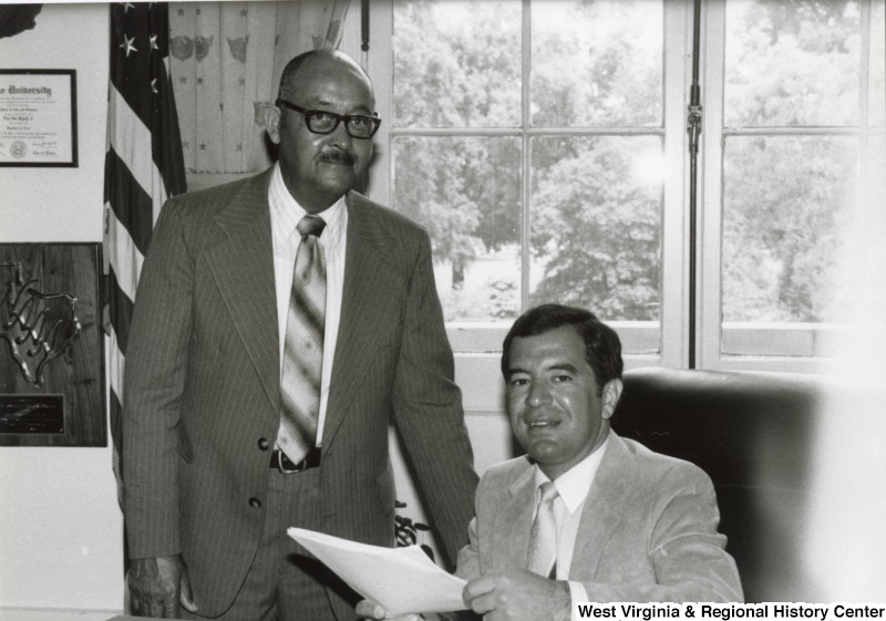 - Congressman Nick Rahall II in his office with an unidentified man. Rahall is seated at his desk and holding a piece of paper.