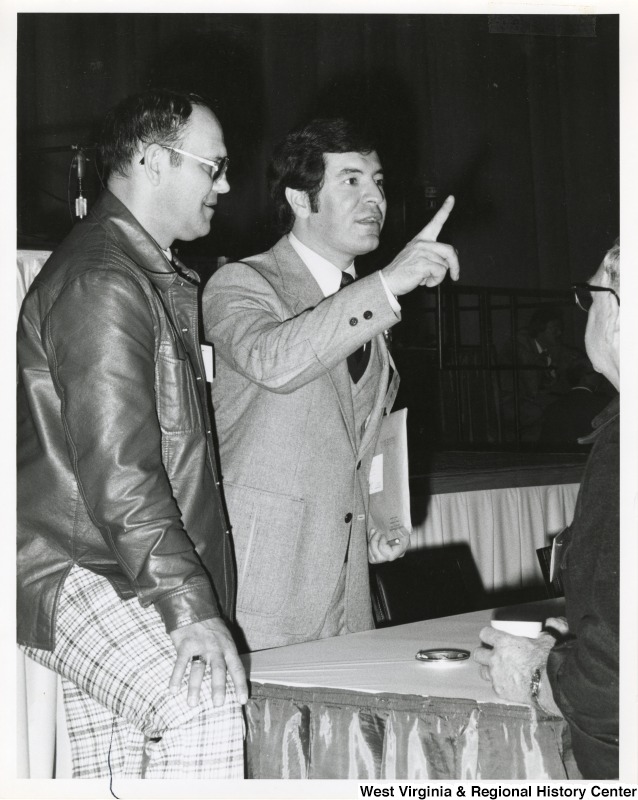 - On the right, Representative Nick J. Rahall (D-W.Va.) stands and points while talking next to an unidentified man.