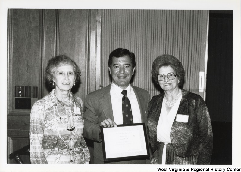- Representative Nick J. Rahall (D-W.Va) smiles for a photograph holding an award between two unidentified women of the Raleigh County Democratic Women's Club.