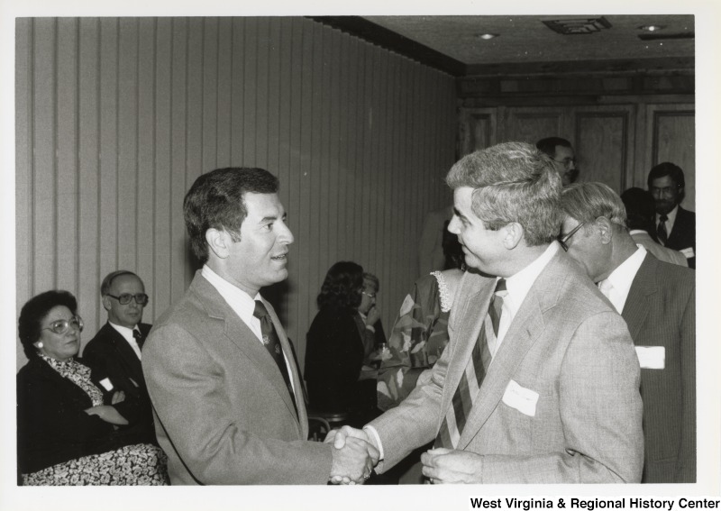 - On the left, Representative Nick J. Rahall (D-W.Va.) shakes hands with an unidentified man at an event.