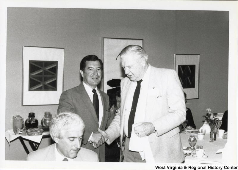 - On the left, Representative Nick J. Rahall (D-W.Va.) shakes hands with Senator Jennings Randolph (D-W.Va.).