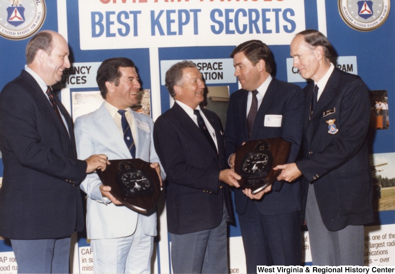- Photograph of Congressman Rahall with four unidentified men of the Civil Air Patrol